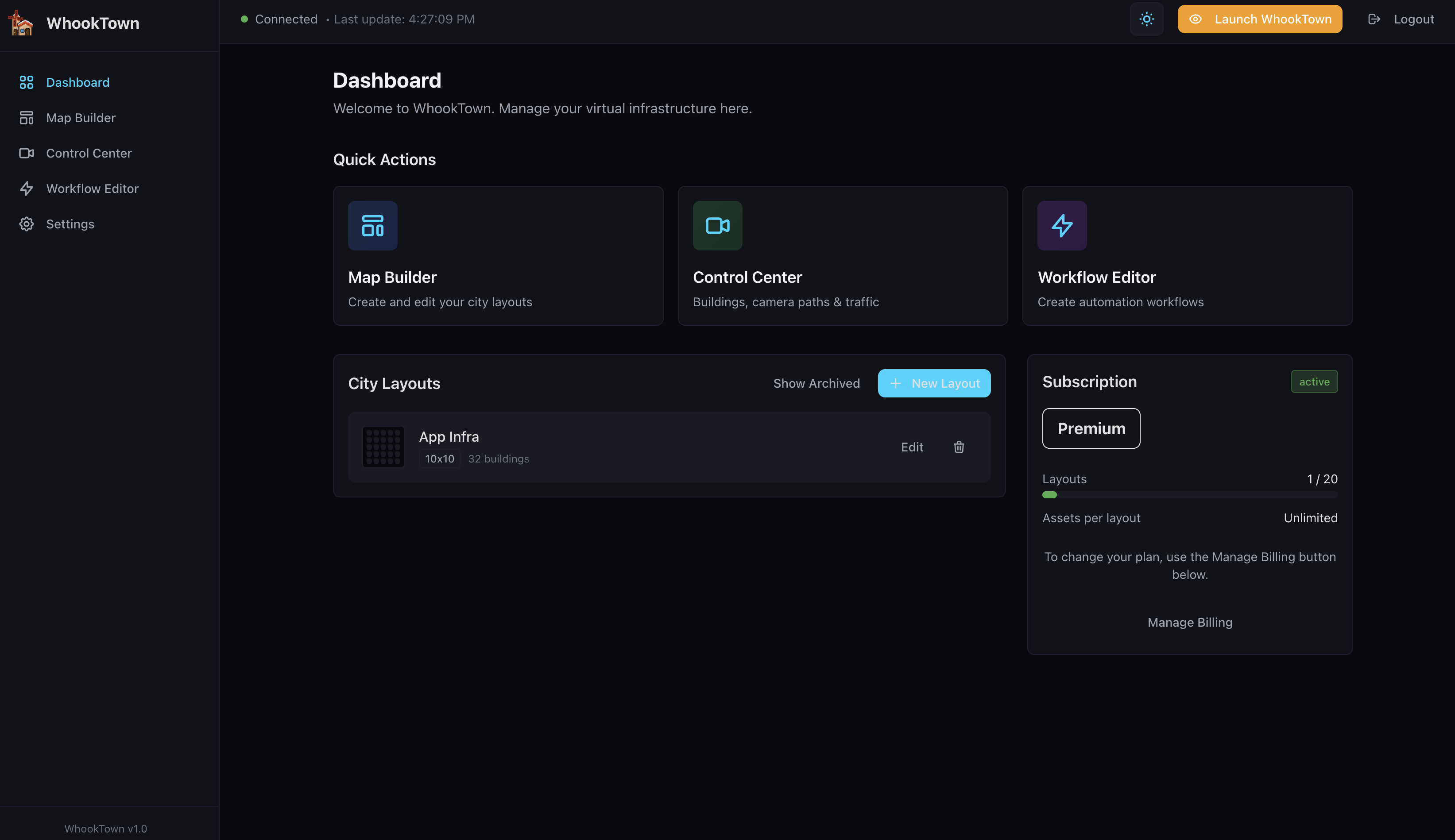 Let's build your first WhookTown city! In this tutorial, you'll create a simple layout with a few buildings, then launch the 3D scene to see it come alive.