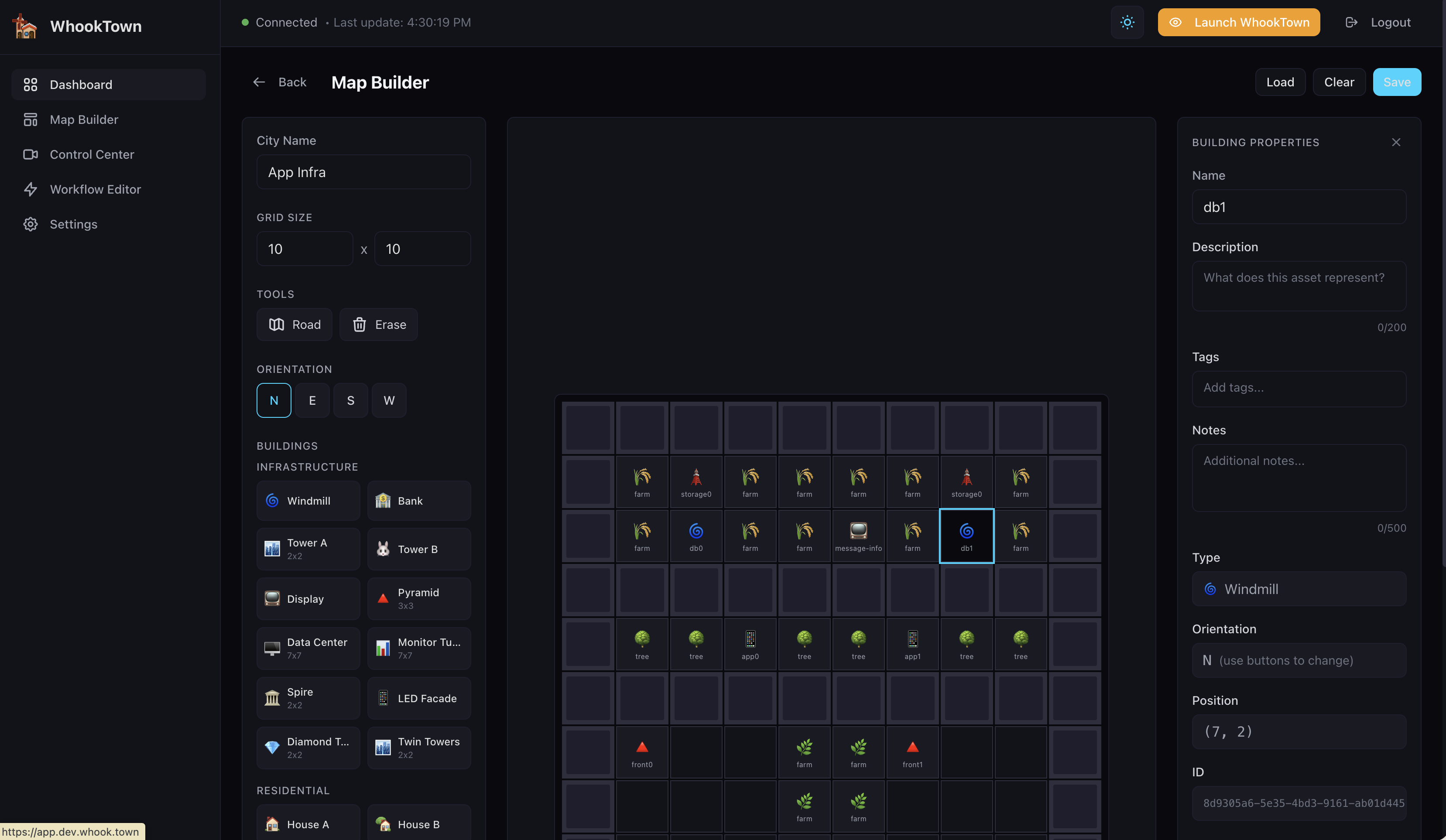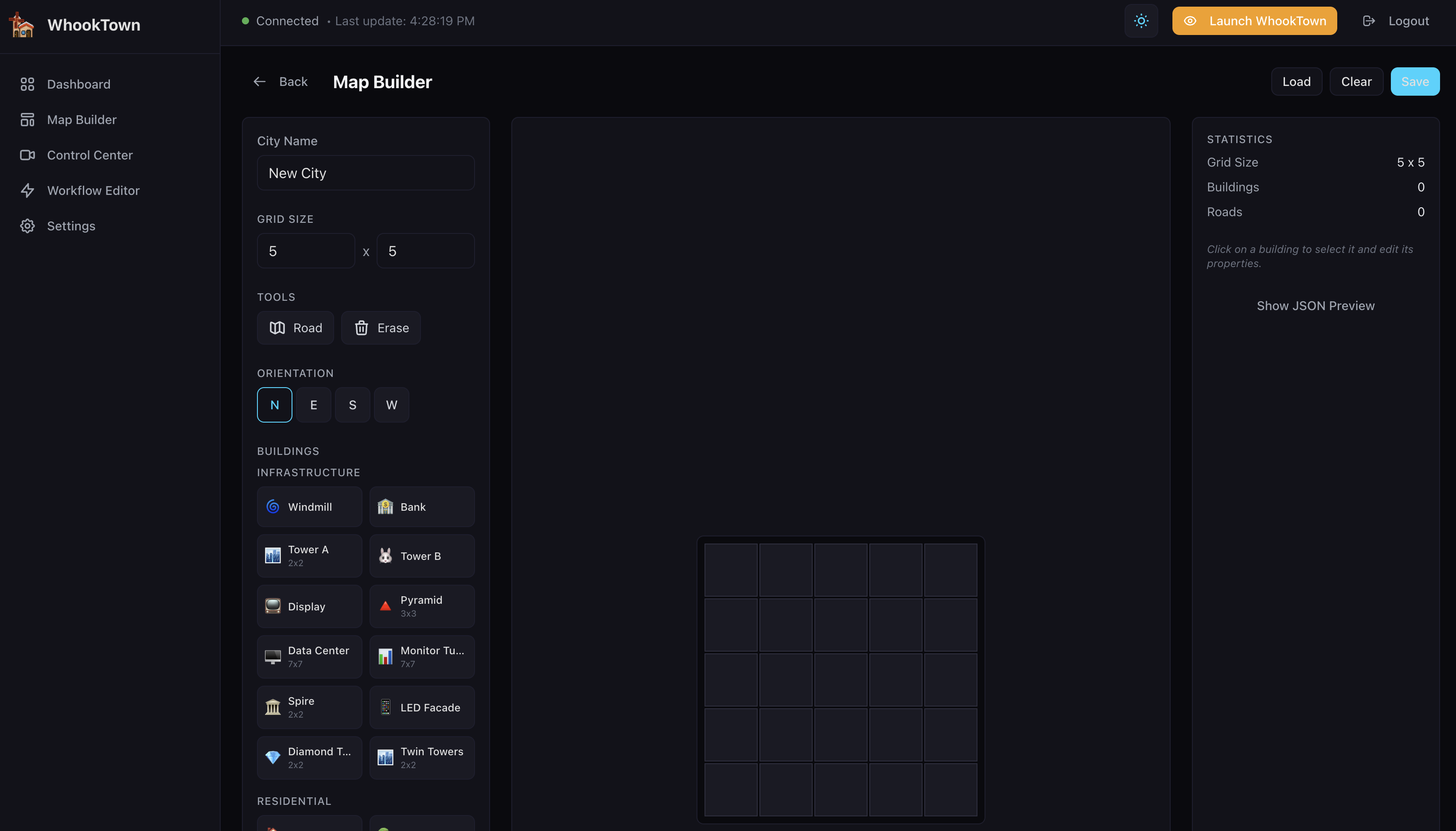 The Map Builder is where you design your city layouts. Place buildings on a grid, draw roads, and configure building properties.